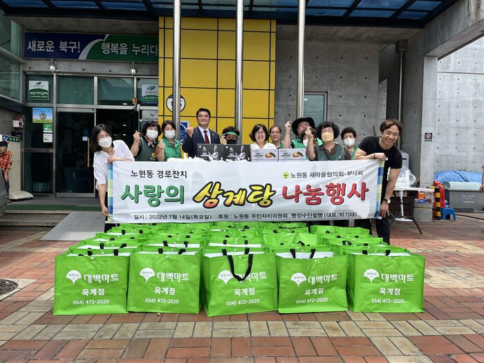 [로컬세계=박세환 기자] 대구광역시 북구 노원동 새마을협의회(회장 김동석)와 새마을부녀회(회장 김영숙)는 7월 14일(목) 초복을 맞아 삼계탕 400인분과 단팥빵 200개를 관내 경로당 8곳과 저소득 취약계층에 전달했다.