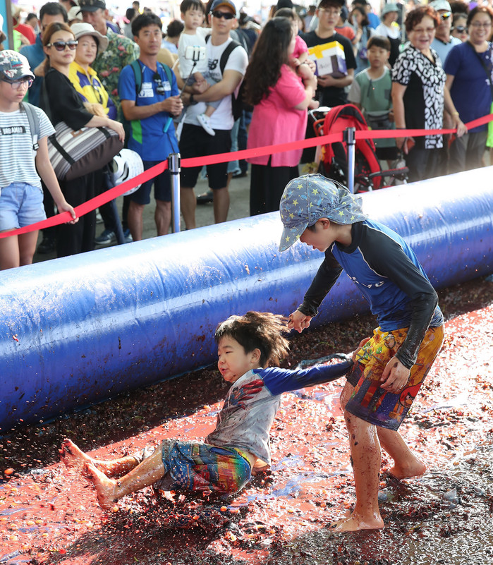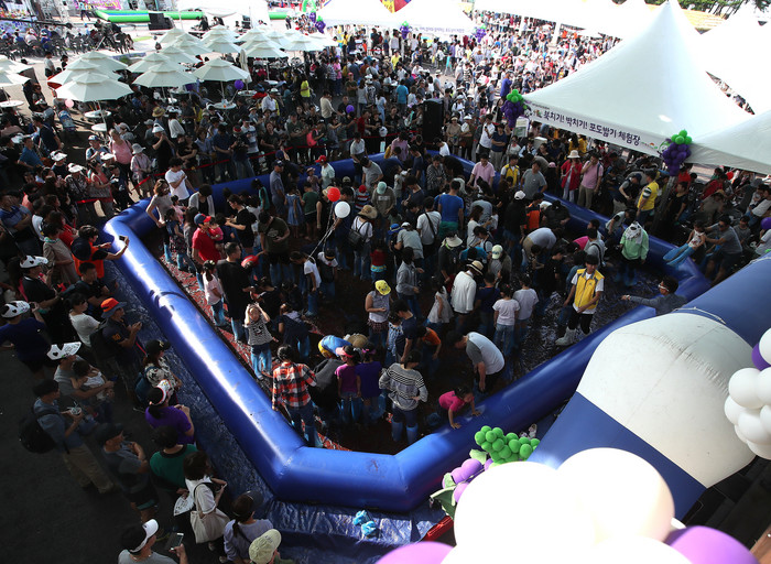 축제장에서 단연 인기를 끈 것은 포도밟기 체험으로 수많은 시민들이 함께 어울려 포도밟기에 열중하는 장관도 연출했다.