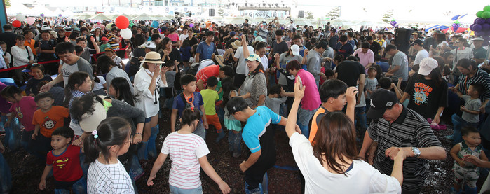 | ▲참가자들이 화성송산포도축제 포도밟기를 하고 있다.(사진제공=화성시청) |