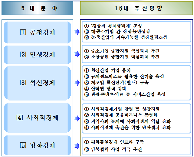 5대 정책을 보면 공정경제는 정상적 경제생태계 조성을 위해 공정거래와 대중소기업간 상생협력을 지원하고, 입찰담합 등 부당행위 근절을 위한 지자체의 역할을 강화하기 위해 올 상반기 공정거래추진단을 발족한다.
