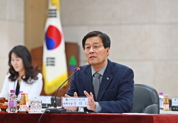 ▲류태호 태백시장이 4일 태백시청에서 열린 제2회 폐광지역 시장‧군수협의회에서 안건을 제안하고 있다.(태백시 제공) |