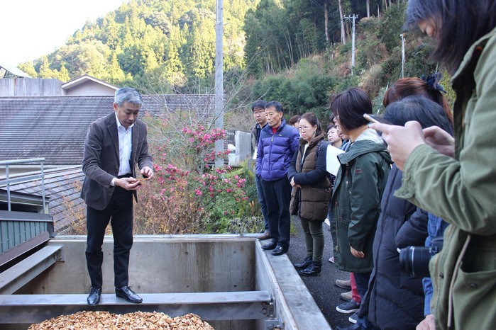 ▲‘2018 사회적경제 해외사례 견학교육’에 참가한 사회적경제기업인들이 이로도리 관계자의 목재 바이오매스에 대한 설명을 듣고 있는 모습.(강원랜드희망재단 제공) |