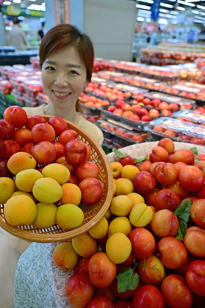▲ 26일 서울 서초구 농협 하나로마트 양재점에서 모델이 ‘살구와 자두’를 선보이고 있다. |