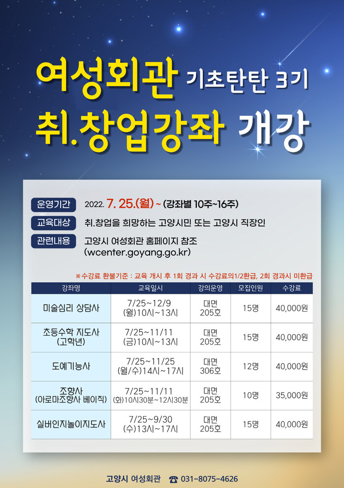 자세한 내용은 고양시 여성회관 홈페이지와 전화로 확인하면 된다.
