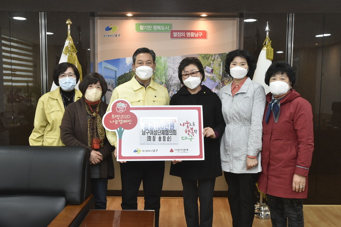[로컬세계 박세환 기자]대구 남구는 지난 9일 남구여성단체협의회(회장 송정순)에서 코로나19 확산에 따른 지역의 위기 극복을 위해 성금 100만원을 전달했다고 10일 밝혔다.