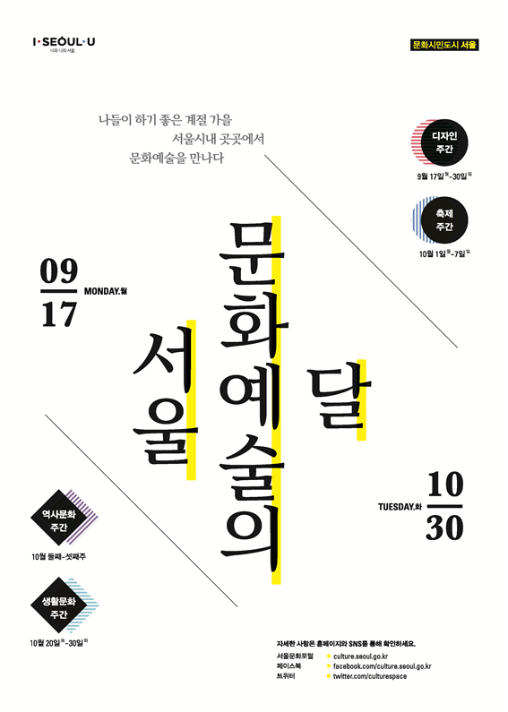 서울 문화예술의 달은 각 분야별 ▲디자인주간 ▲축제주간 ▲역사문화주간 ▲생활문화주간 총 4개 주간에 해당되는 40여개 행사를 일정에 따라 소개하고 있다.