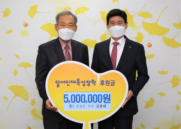 달서구 진천동 주민인 김종태씨는 2011년 송일초등학교 교장으로 퇴직 후 마을 청소를 하면서 모은 재활용품 판매수익금을 모아 작년(500만원)에 이어 올해도 500만원을 장학금을 기탁했다.