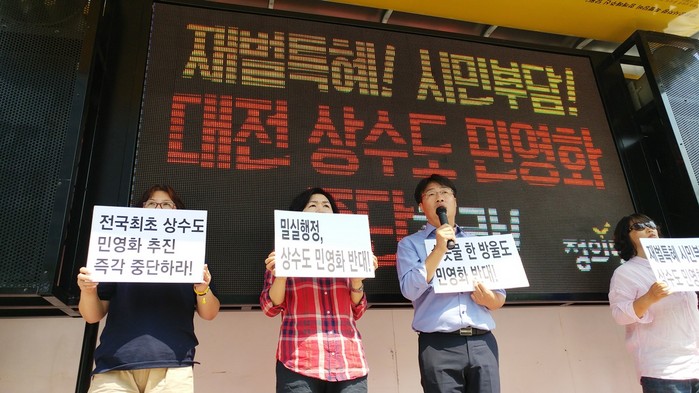 이날 김윤기 공동위원장은 “대전시가 민간위탁이라는 말을 하는데 민영화라 부르던 민간위탁이라 부르던지 누가 가장 큰 이익을 얻게 되는지가 본질”이라며 “시민의 세금으로 사업자의 수익까지 보장해주면서 누구 좋으라고 수돗물을 민영화하겠다는 것인가”라고 강하게 비판했다.