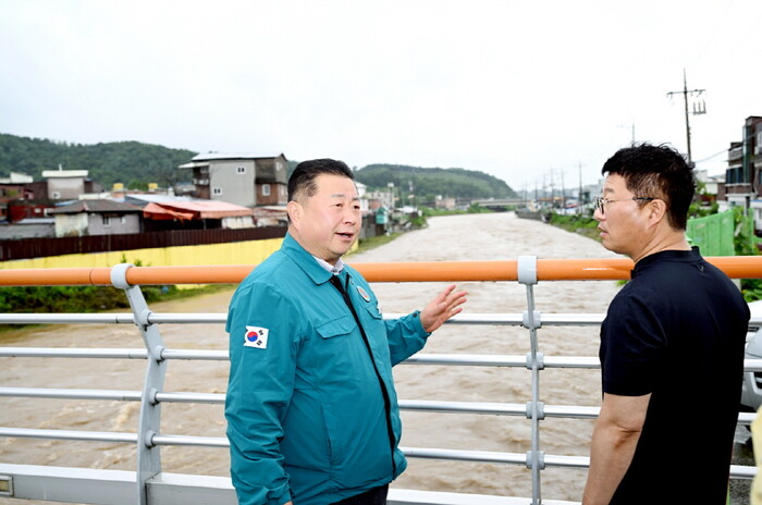 ▲ 지난 7월 18일 집중호우 피해 현장인 갈곡천을 방문한 김경일 시장.(파주시 제공) |