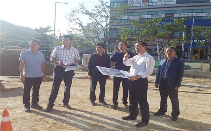 ▲김동섭 대전시의원은 11일 관계공무원과 함께 반석역광장 리모델링공사 현장을 방문해 안전대책을 점검하고 있다. |