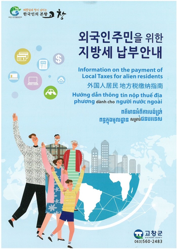 29일 군에 따르면 외국인 납세자가 점차 더 늘어날 것으로 예상돼 지방세 납부방법, 자동차세, 주민세, 취득세 등 실생활에 밀접하게 연관된 내용을 담아 영어, 베트남어, 캄보디아어, 중국어 등 4개 외국어 맞춤형으로 500부를 제작했다고 밝혔다.