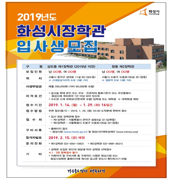 | ▲2019년 화성시장학관 입사생 모집 포스터. |