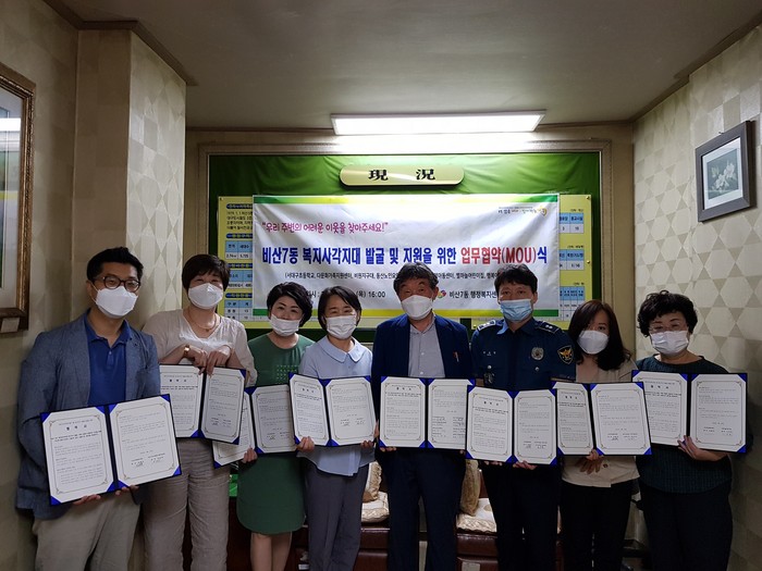 [로컬세계 박세환 기자]대구 서구 비산7동행정복지센터는 지난 25일 행정복지센터에서 관내 서대구초등학교, 다문화가족지원센터, 비원지구대, 동산노인요양센터, 꿈이있는집지역아동센터, 별하늘어린이집, 행복이가득한어린이집과 ‘복지사각지대발굴 및 지원 업무협약(MOU)’ 체결했다.