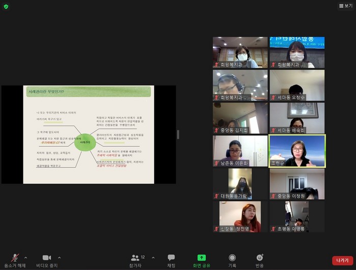 이번 컨설팅은 경성대학교 사회복지학과 조현순 교수가 컨설턴트로 참가해 찾아가는 보건복지팀의 통합사례관리 업무 담당자 15명을 대상으로 ▲사례관리과정의 이해와 적용 ▲전문적인 개입기술과 기록기법에 대해 다각적인 논의를 진행했다.