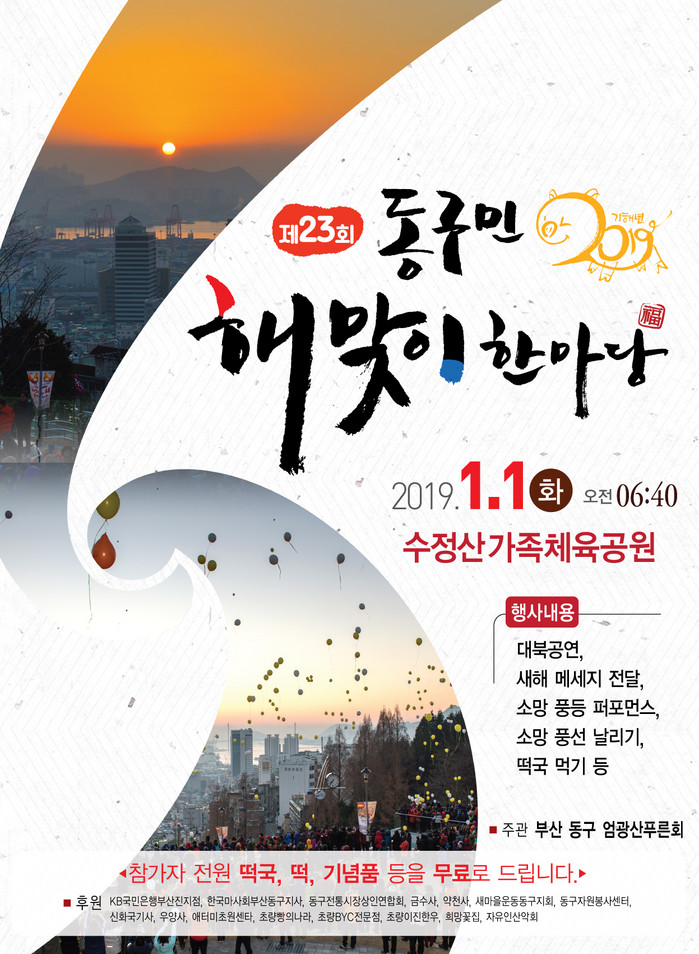 [로컬세계 맹화찬 기자]부산 동구는 새해를 맞아 오는 1월 1일 오전 6시 40분부터 수정산 가족체육공원에서 구민과 함께하는 해맞이 한마당 행사를 가진다고 밝혔다.