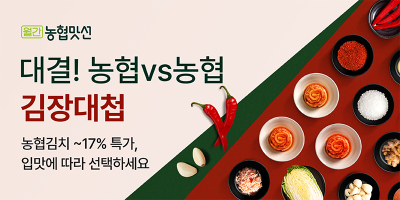 오는 12월 14일까지 진행하는 농협맛선의‘김장대첩’에서는 ▲표준맛 ▲전라도맛 ▲경상도맛의 김치를 최대 17% 할인된 가격에 만나볼 수 있으며, 직접 내 손으로 담그는 김치를 원하는 고객은 절임배추와 양념으로 구성된 김장키트도 선택할 수 있다.