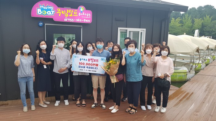 이날 김은자 관광과장을 비롯해 관광과 직원 10여 명이 참석한 가운데 무빙보트 10만 번째 이용객을 축하하는 깜짝 이벤트를 벌였다.