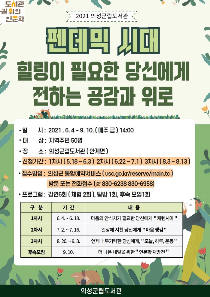 올해 의성군립도서관은 유래없는 코로나19 상황에 지친 주민들의 마음을 인문학을 통해 회복하고자 ‘팬데믹 시대, 힐링이 필요한 당신에게 전하는 공감과 위로’를 큰 주제로 하여, 6월부터 9월까지 총 3차시 프로그램을 운영한다.