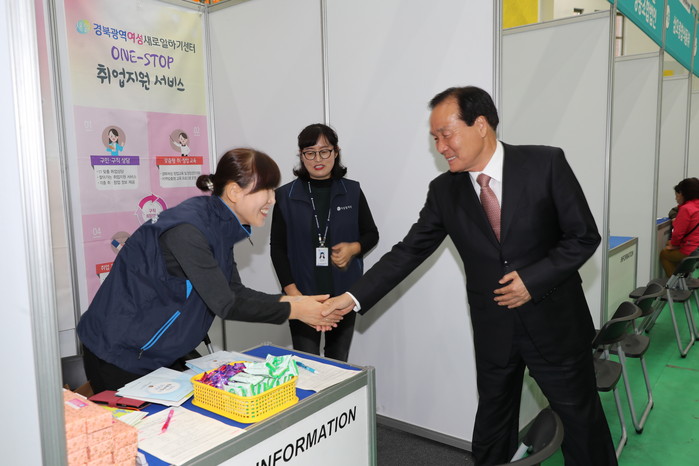 | ▲김주수 군수(오른쪽)가 의성군 기업애로해결·일자리 박람회를 돌며 관계자들과 인사를 나누고 있다.(의성군 제공) |