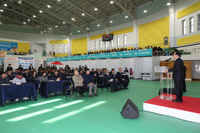 | ▲2018년 의성군 기업애로해결·일자리 박람회에서 김주수 군수(오른쪽)가 인사말을 하고 있다. |