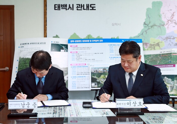 ▲ 이상호 태백시장(오른쪽)과 남궁 증 태백시시설관리공단 이사장이 공공시설물 위·수탁 계약서에 서명하고 있다. 태백시 제공 |
