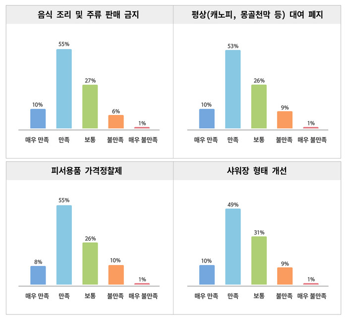 쾌적하고 안전한 해수욕장 분위기 조성을 위한 ‘음식 조리 및 주류 판매 금지’의 경우 ‘매우 만족’과 ‘만족’이 65%, ‘보통’ 27%로 나타났으며, ‘불만족’ 또는 ‘매우 불만족’은 합쳐서 7%에 불과했다.