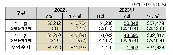 이날 관세청이 발표한 '2023년 7월 월간 수출입 현황(확정치)'에 따르면 7월 수출은 500억 달러를 상회했으나, 기저효과(2022년 7월은 역대 7월 수출액 최대)로 인해 전년동기대비 감소했다"고 설명했다.