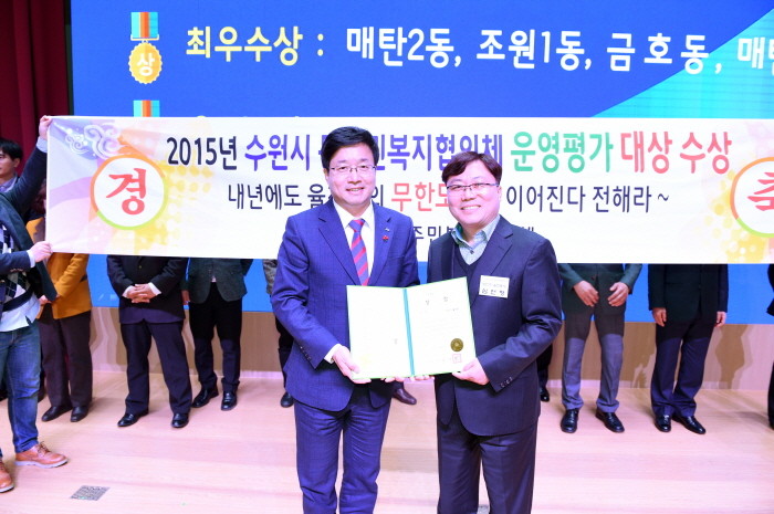 | ▲지난 11일 염태영 수원시장(왼쪽)이 ‘2015 동주민복지협의체 활동보고회’에서 대상을 차지한 심언형 율천동장에게 상장을 수여하고 있다. |