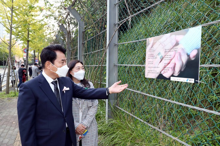 | ▲백군기 용인시장이 '시가 있는 길'에서 시민들의 작품을 감상하고 있다. |