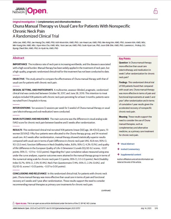 ▲ ‘JAMA Network Open’ 2021년 7월호에 게재된 해당 연구 논문 「Chuna Manual therapy versus usual care for non-specific chronic neck pain: a multicenter, pragmatic, randomized controlled trial」 |