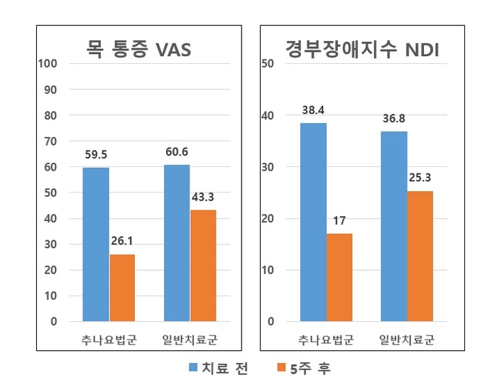 연구에 따르면 측정된 모든 지표에서 추나요법군이 일반치료군보다 치료 효과가 탁월했다. 두 집단이 5주간 주 2회, 총 10회 치료를 받고 평가 지표를 측정한 결과 추나요법군의 목 통증 VAS는 치료전(59.5)에서 치료후(26.1)로 감소해 절반 이상인 56%의 통증감소가 일어났다. 반면 일반치료군에서 치료전 60.6에 달했던 VAS는 치료 후 29% 정도만 감소해 43.3에 그치며 통증 경감이 크지 않았다.