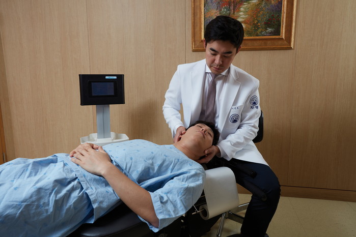 ▲자생한방병원 이진호 병원장이 목 통증 환자에게 추나요법을 하고 있다. |