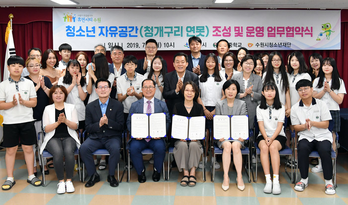 세 기관은 8일 송원중학교 시청각실에서 ‘수원시 청소년 자유 공간 조성·운영을 위한 업무협약’을 체결하고, ‘청개구리 연못’ 조성에 협력하기로 했다.