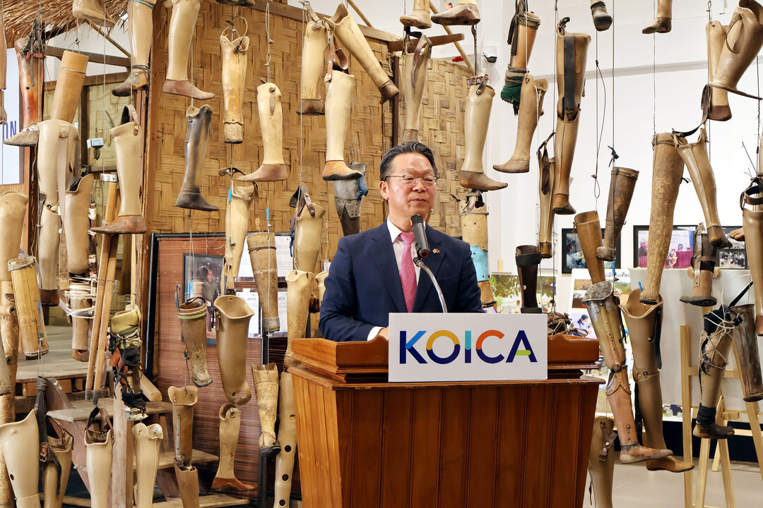 코이카(KOICA‧한국국제협력단)가 16일(현지시간) 라오스 수도 비엔티안‘COPE 센터’에서 불발탄 문제의 심각성과 불발탄 피해자 지원 성과를 알리기 위해 개최한 ‘K+HOPE’ 캠페인 현장에서 정영수 주라오스 대한민국 대사가 방문객들에게 환영사를 하고 있다.