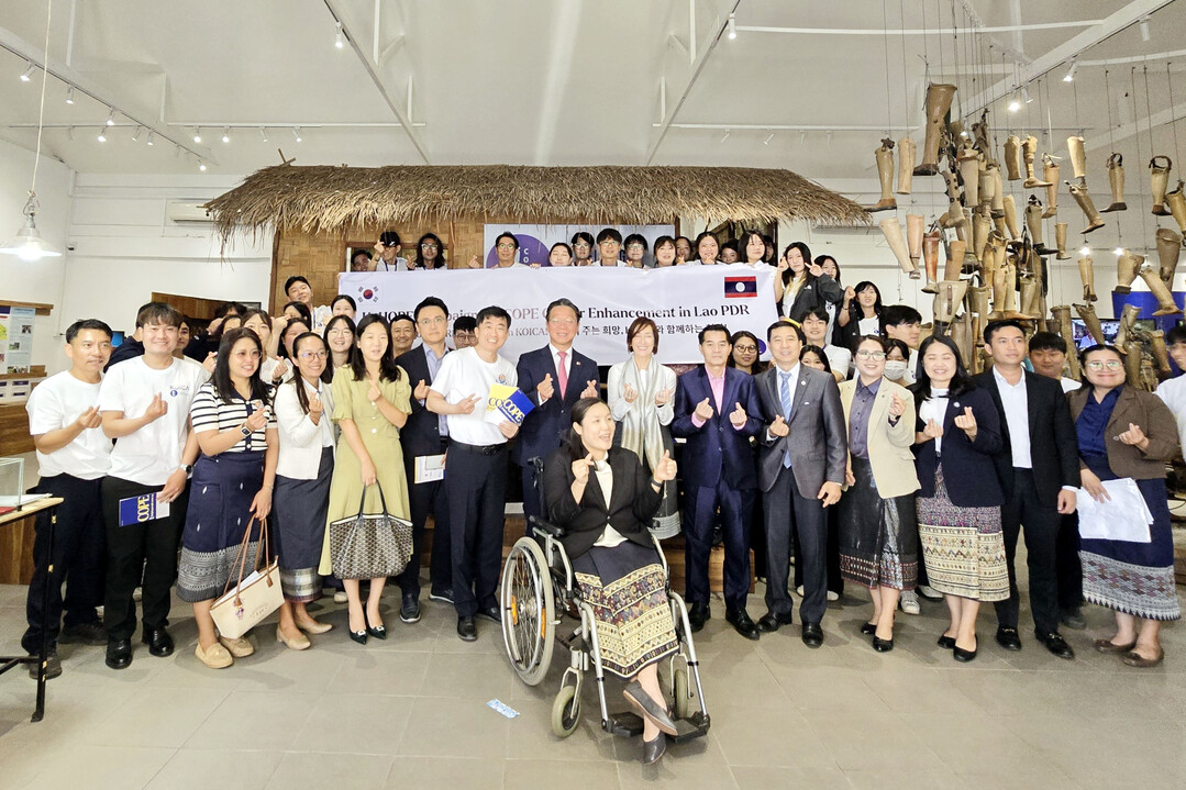 코이카(KOICA‧한국국제협력단)가 16일(현지시간) 라오스 수도 비엔티안‘COPE 센터’에서 불발탄 문제의 심각성과 불발탄 피해자 지원 성과를 알리기 위해 개최한 ‘K+HOPE’ 캠페인에서 주요 참석자들이 단체사진을 촬영하고 있다.