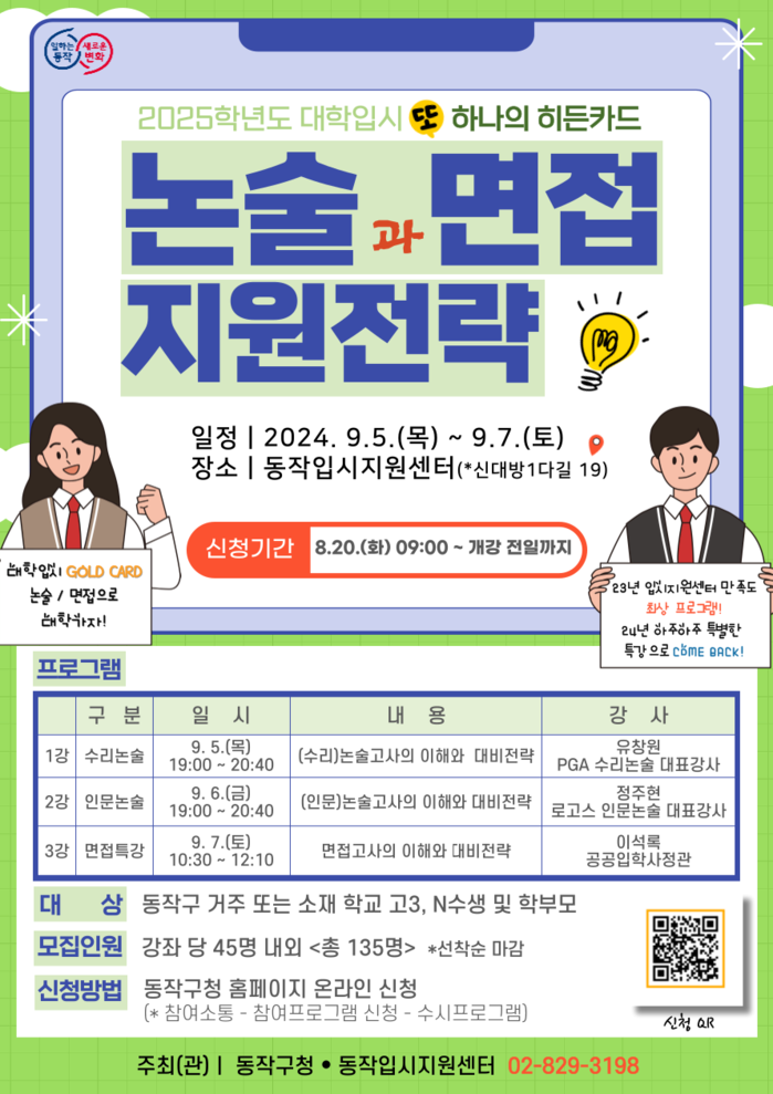 참여대상은 동작구 거주 또는 소재 학교 대입 수험생 및 학부모이며, 강좌당 45명 내외로 총 135명을 선착순 모집한다.