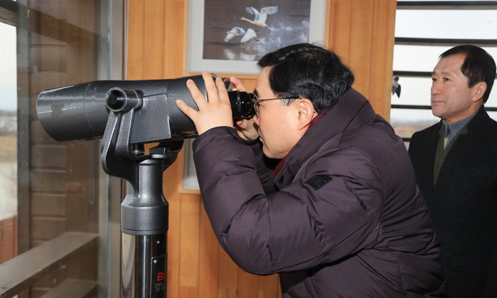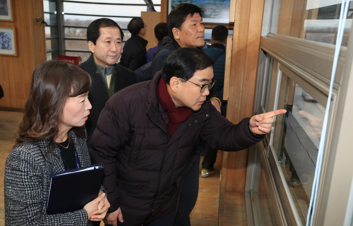 주요 업무 현황을 파악한 뒤에는 주남저수지 일대를 돌며 재두루미 등 철새들을 관찰했다. 철새 먹이주기 사업, 연 군락지 제거 사업 등에 대한 설명을 듣고, 탐조객들의 불편사항은 없는지 꼼꼼히 살폈다.