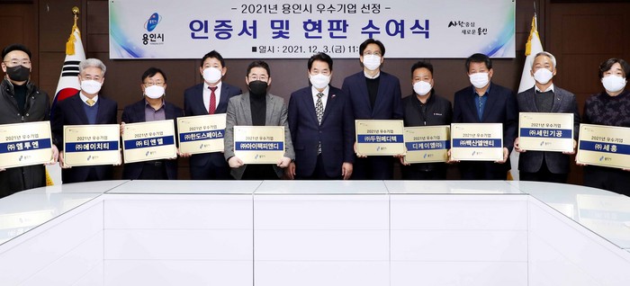 | ▲백군기 용인시장이 2021년 용인시 우수 중소기업 10개사에 인증서 및 현판을 수여했다. 용인시 제공 |