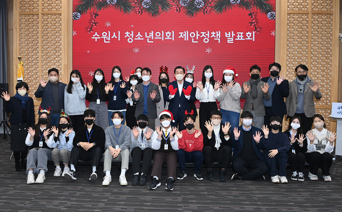 수원시가 17일 시청 중회의실에서 ‘2022년 수원시 청소년의회 제안정책 발표회’에서 청소년의회 의원들은 ▲우리는 수원페이로 버스 탄다!(기획경제위원회) ▲수원시 자립준비 청년 법률 및 심리 상담 지원·개인형 이동장치(PM) 주차장 확대(복지안전위원회) ▲청소년 수련시설 활성화(문화체육교육위원회) ▲학교 내 환경교육 개선 방안·플라스틱 컵 수거 기계 설치 시범사업(도시환경위원회) 등 5개 제안정책을 발표했다.