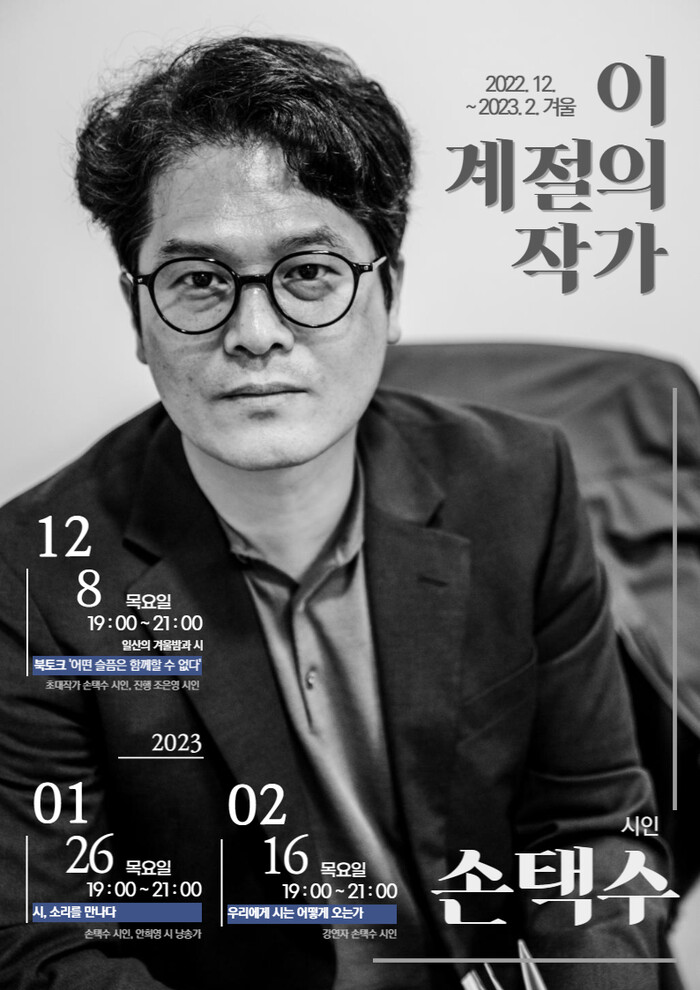 강연자 손택수 시인은 “우리는 모두 시인으로 태어난다. 그 사실을 잊고 있을 뿐이다. 이 강연은 자기 안의 시를 깨우고 더께가 낀 일상의 시간대 속에서 신생을 경험하는 시간이 될 것”이라고 전했다.