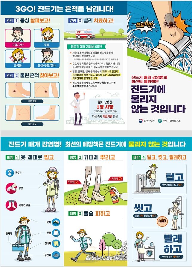 진드기 매개 감염병의 대표적 질환 중 하나인 중증열성혈소판감소증후군은 이 증후군 바이러스를 보유한 참진드기에 물린 후 고열, 소화기증상(오심, 구토, 설사) 등이 나타나며, 주로 7월부터 10월까지 발생이 증가한다. 중증열성혈소판감소증후군은 치사율이 높은 감염병이나 전용 치료제나 백신이 없어 야외활동 시 진드기에 물리지 않도록 하는 것이 무엇보다 중요하다.