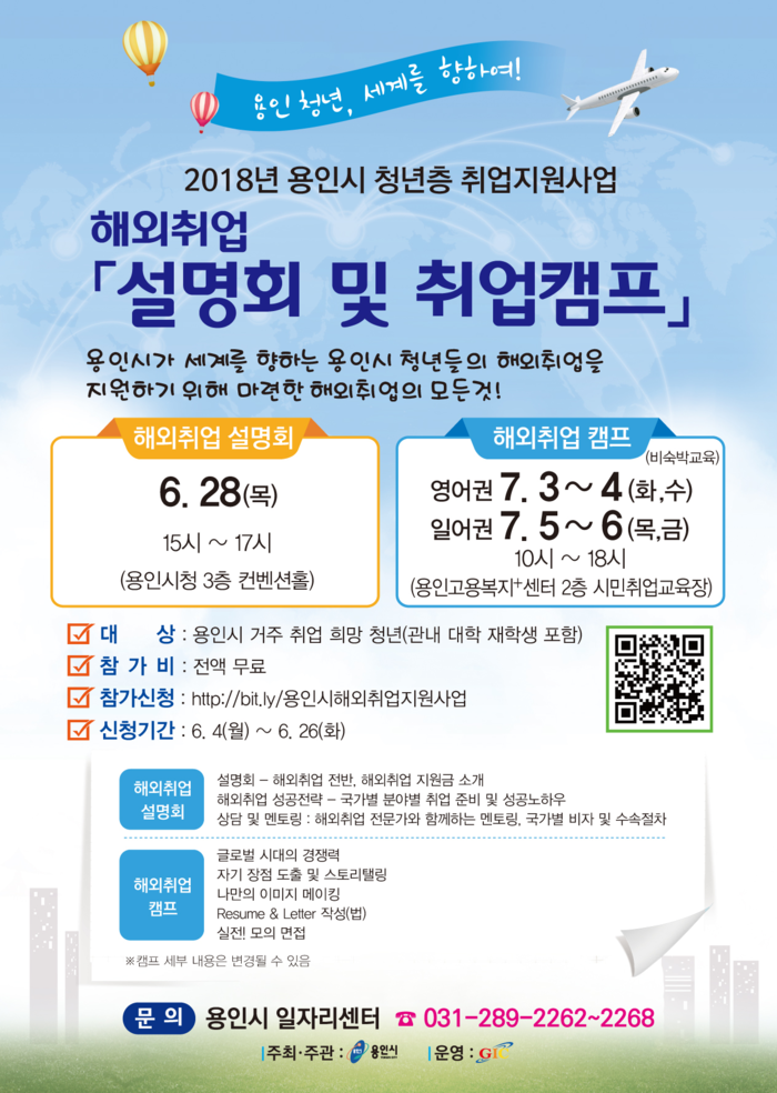 [로컬세계 주덕신 기자]용인시는 해외취업에 관심이 있는 만 18세 이상 34세 미만 청년 구직자를 대상으로 해외취업설명회와 역량강화 캠프를 운영해 이달 26일까지 참가자를 모집한다.