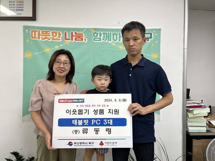 [로컬세계 부산=맹화찬 기자]부산 북구는 지난 9일 주민 류동령 씨가 둘째 아들 류서준 군의 생일을 맞이하여 지역 내 어려운 가정의 아이들을 위해 태블릿PC 3대를 기부했다고 밝혔다.
