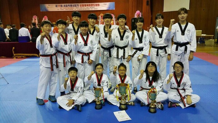 ▲지난해 마포구 청소년 태권도시범단원들이 제11회 서울시장기 생활체육태권도대회에 참석한 뒤 기념촬영을 하고 있다. |
