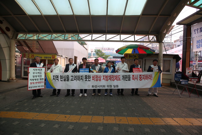▲화성시의회 의원들이 30일 병점역에서 지방재정제도 개편안의 즉각적인 철회를 촉구하고 있다. |
