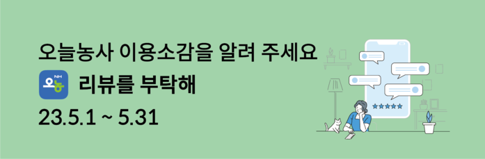 농협중앙회(회장 이성희)는 'NH오늘농사' 가입자의 다양한 의견을 반영하기 위한 ‘ 앱 리뷰를 부탁해!’ 이벤트를 이번 달 31일까지 실시한다고 2일 밝혔다.