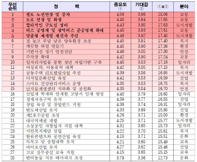 이어 ▲ 질 높고 부담 낮은 양육환경 ▲깨끗한 하천만들기 ▲기반시설 정기안전진단 ▲주차장 확대 ▲일자리사업을 통한 자립기반 구축 등이 뒤를 이었다.