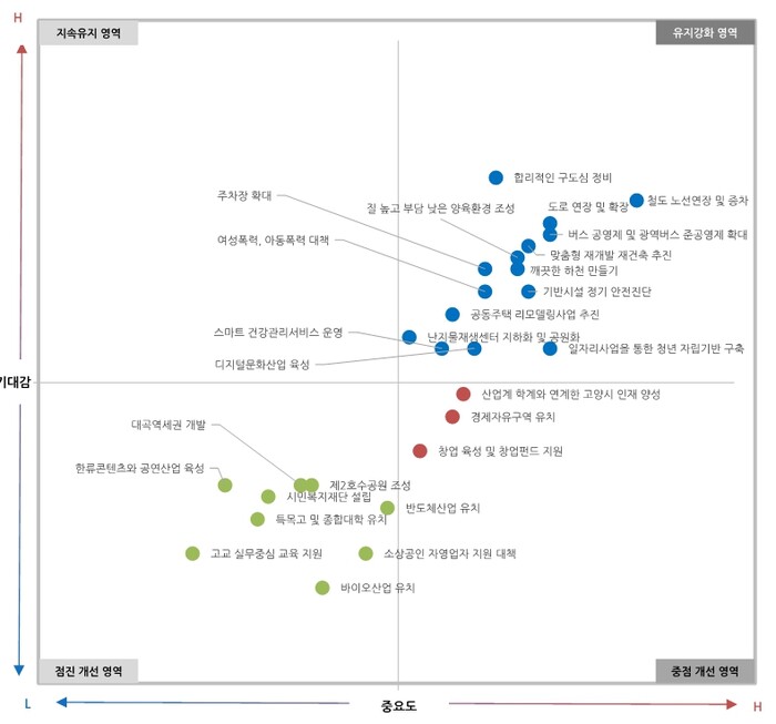 그 중 ▲철도 노선연장 및 증차 ▲도로 연장 및 확장 ▲합리적인 구도심 정비 ▲버스 공영제 및 광역버스 준공영제 확대 ▲맞춤형 재개발 재건축 추진 순으로 시민들의 기대감과 중요도가 높은 것으로 분석되었다.