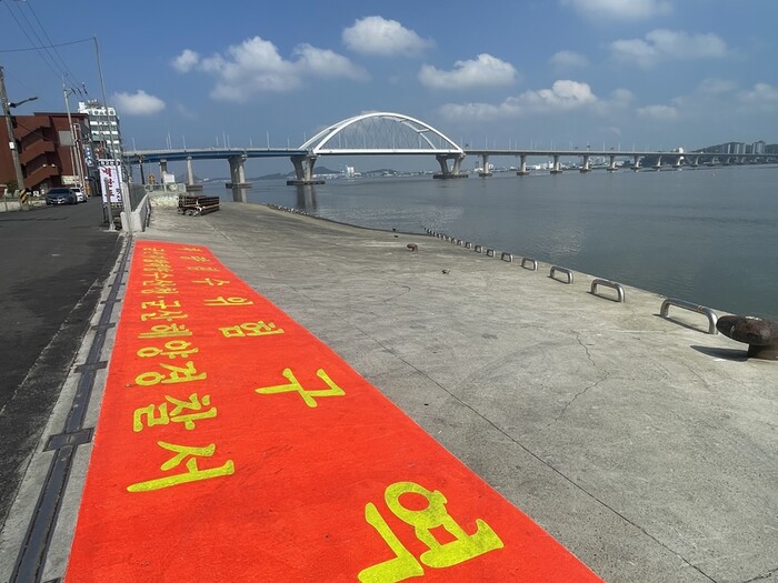 ▲ 군산 내항 물량장 입구에 조수간만의 차에 따른 차량침수 위험안내판을 설치하고 주차가능공간에 야광페인트를 이용해 침수경고를 알리고 있다.(군산해경 제공) |