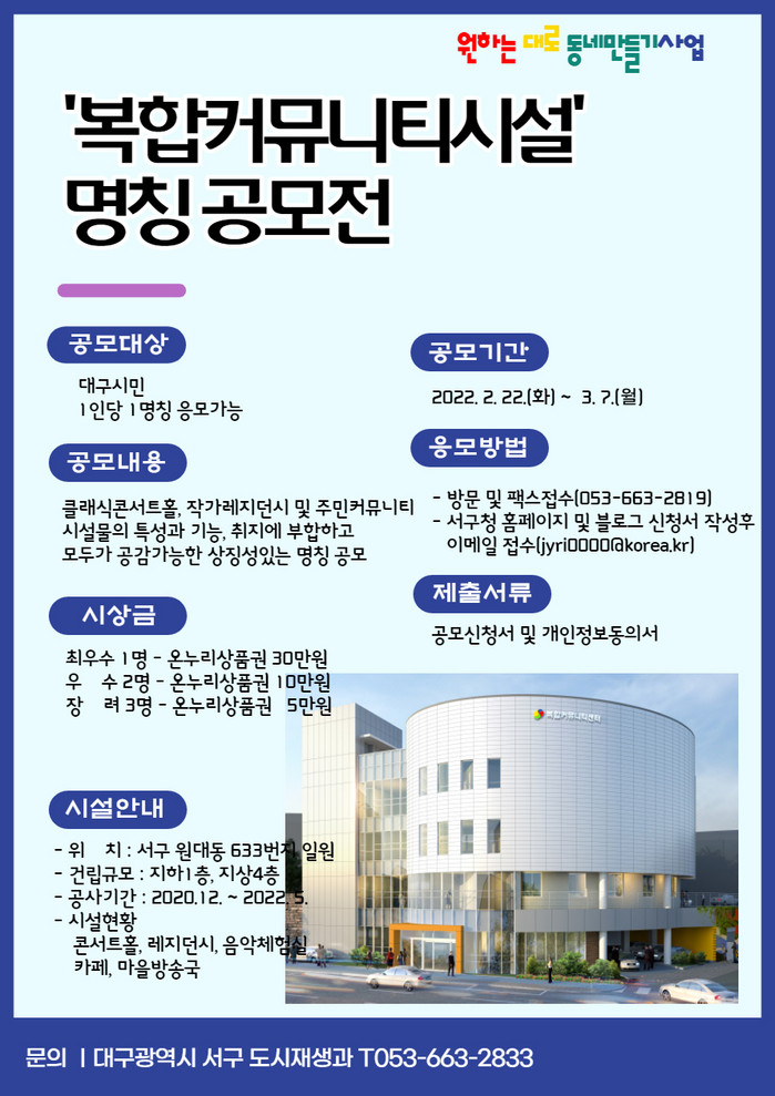 [로컬세계 박세환 기자]대구 서구청은 원대동 633번지 일원에 건립 중인 (가칭)비원 뮤직홀의 명칭을 공모한다.
